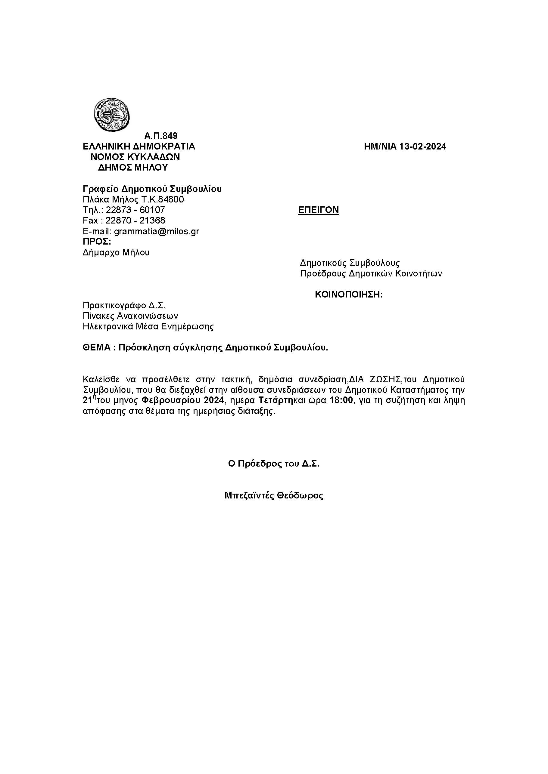 Αυτοδιοίκηση Πρόσκληση 3ης σύγκλησης Δημοτικού Συμβουλίου 19 Φεβ 2024 Εμφανίσεις: 714 Tweet Share Share Share