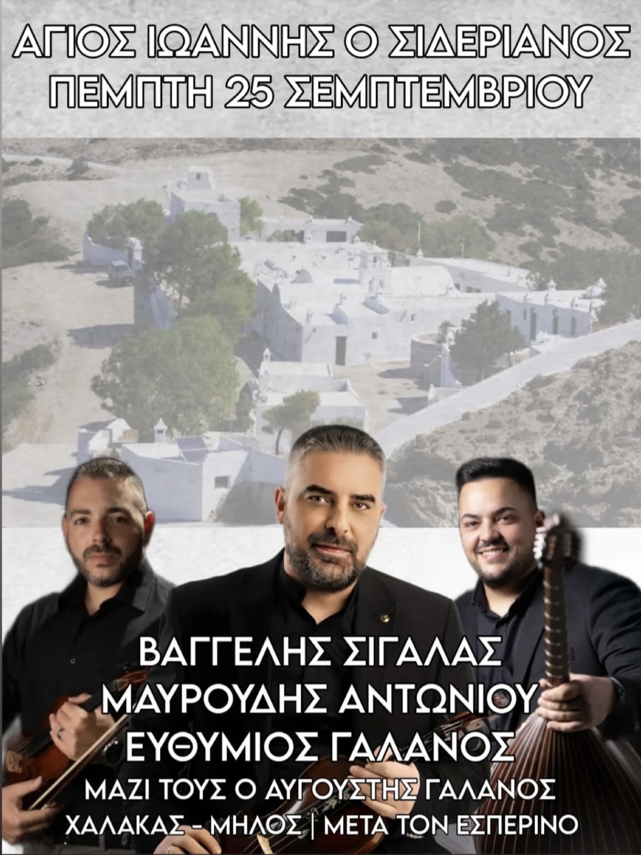 Με ιδιαίτερη χαρά ανακοινώνεται ότι την Πέμπτη 25 Σεπτεμβρίου, η Εκκλησία μας τιμά τη μνήμη του Αγίου Ιωάννου του Θεολόγου, στον Ιερό Ναό Αγίου Ιωάννου του Σιδεριανού στη Μήλο , θα τελεσθεί η καθιερωμένη Ιερά Πανήγυρις.