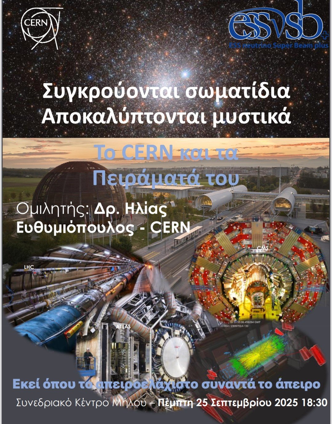 Στο Συνεδριακό Κέντρο Μήλου θα πραγματοποιηθεί την Πέμπτη 25 Σεπτεμβρίου 2025 και ώρα 18:30 ομιλία του Δρ. Ηλία Ευθυμιόπουλου, Senior Physicist στο CERN, με θέμα: