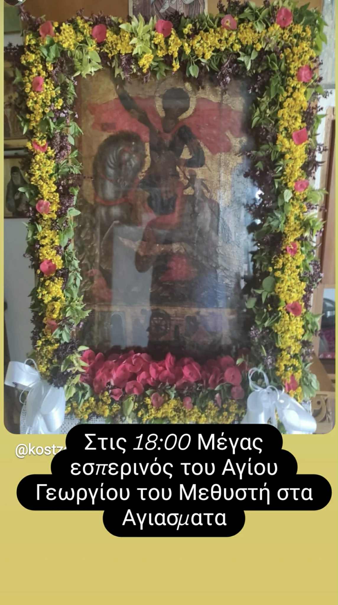 Σήμερα παραμονή της ανακομιδής των λειψάνων του Αγίου Γεωργίου του Τροπαιοφόρου. Στις 18:00 Μέγας Εσπερινός μετά αρτοκλασίας στο παρεκκλήσιο του Αγίου Γεωργίου (μεθυστη) στα Αγιάσματα. Σύμφωνα με την παράδοση ονομάζεται μεθυστης γιατί εκείνη τη μέρα άνοιγαν τα βαρέλια και δοκίμαζαν το καινούριο κρασί. Στην ακολουθία της αρτοκλασίας ευλογείται και η νέα παραγωγή κρασιού που φέρνουν οι πιστοί.
