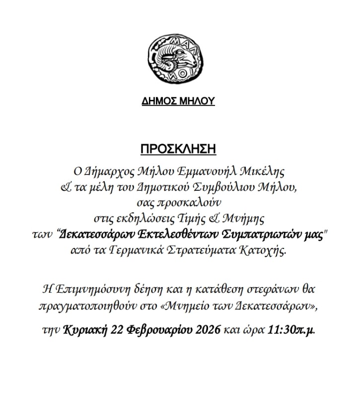 Εκδηλώσεις Επιμνημόσυνη δέηση και κατάθεση στεφάνων στους Δεκατέσσερις 16 Φεβ 2026 Εμφανίσεις: 142 Tweet Share Share Share