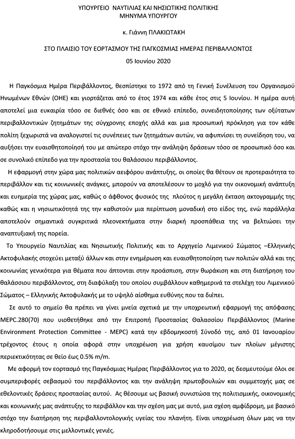 Κυκλάδες – Νησιά Το επετειακό μήνυμα του κ.Υπουργού Ναυτιλίας και Νησιωτικής Πολιτικής κ. Πλακιωτάκη για τον Εορτασμό της Παγκόσμιας Ημέρας Περιβάλλοντος 02 Ιουν 2020 Εμφανίσεις: 545 Tweet Share Share Share