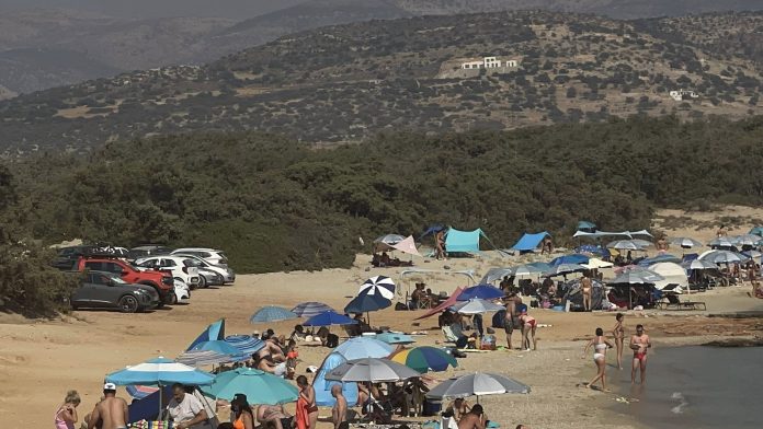 # Αυτοκίνητα παρκαρισμένα πάνω στην αμμουδιά, στις αμμοθίνες και μέσα στο κεδρόδασος.