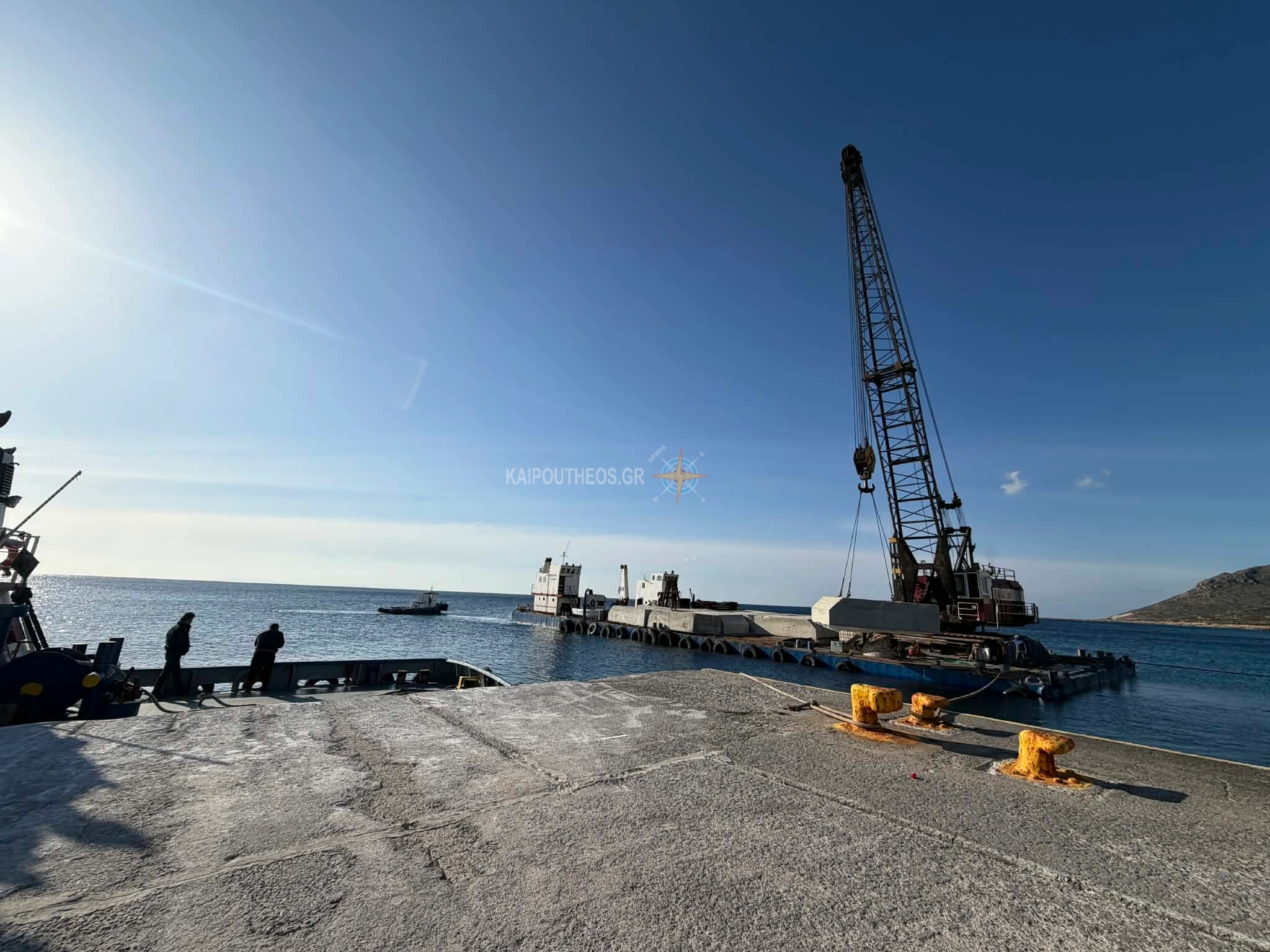 Πλωτός γερανός κατέφθασε σήμερα από την Νάξο στο λιμάνι φορτωμένος με μπλόκια, ξεφόρτωσε και πάει ήδη για δεύτερο δρομολόγιο.