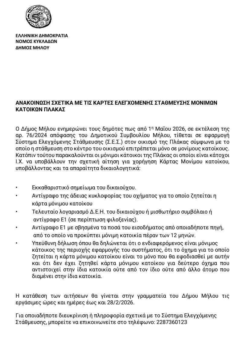 Μήλος Ανακοίνωση σχετικά με τις κάρτες ελεγχόμενη στάθμευση: Αιτήσεις χορήγησης καρτών μονίμων κατοίκων Πλάκας 09 Ιαν 2026 Εμφανίσεις: 229 Tweet Share Share Share
