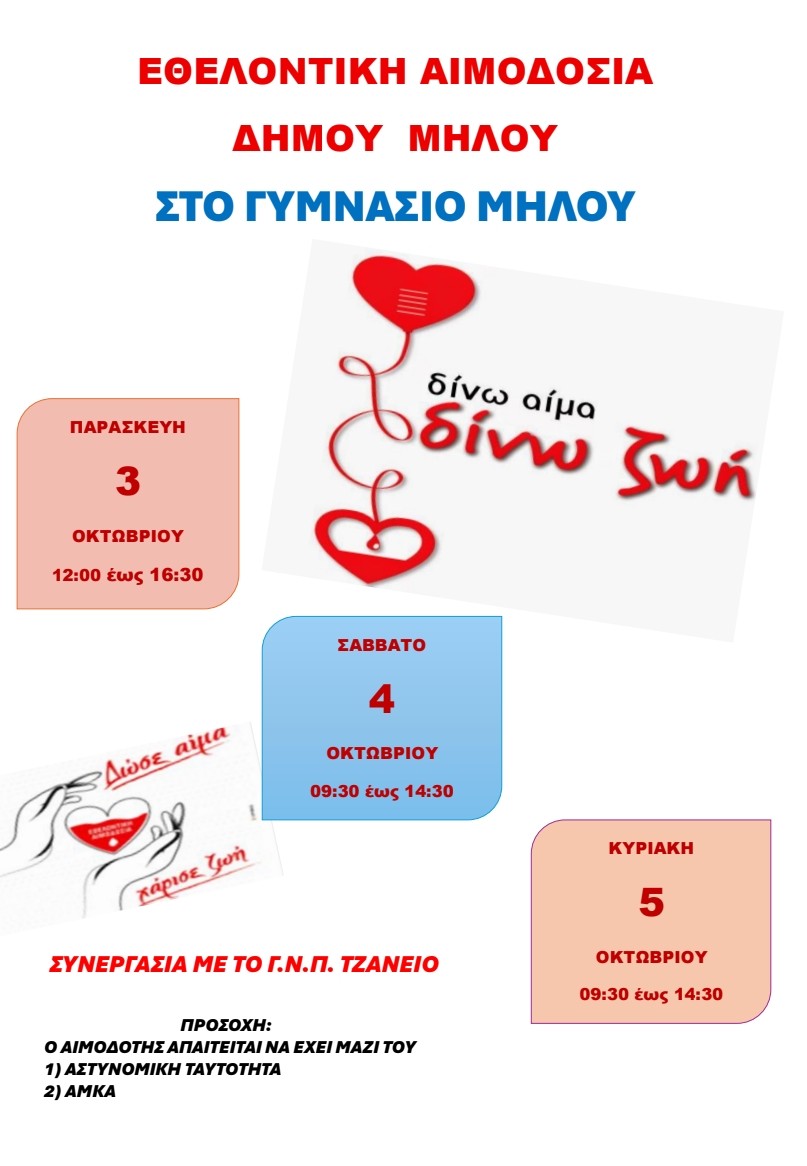 Ο Δήμος Μήλου, σε συνεργασία με το Γ.Ν.Π. «Τζάνειο», διοργανώνει τριήμερη Εθελοντική Αιμοδοσία στο Γυμνάσιο Μήλου: